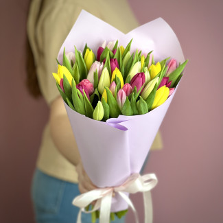 Нежный весенний букет из 35 тюльпанов. Оттенок цветов можно выбирать на сайте, как и вариант упаковки. Предлагаем оригинальное оформление цветочных композиций опытными флористами. Нежные и не до конца распустившиеся тюльпаны истончают приятный аромат, ассоциируются с наступлением весны и совершенством мира природы.