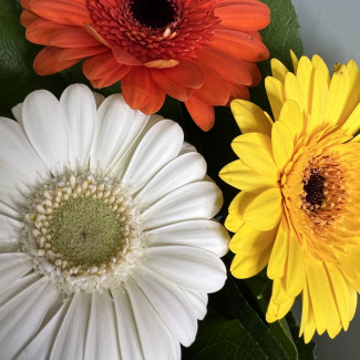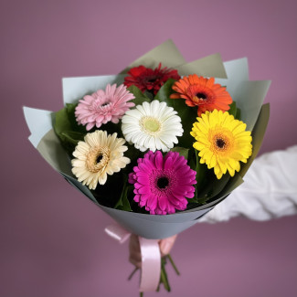 Букет из 7 разноцветных герберов дополненных сочными листьями салала – яркий и чувственный. Подарить цветы в такой композиции можно как по торжественному поводу, так и без него. Настроение букету придаст профессиональное оформление от наших флористов. Качество цветов подтверждает 5-дневная гарантия.