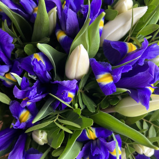 Букет Диана – это легкий свежий бриз, сине-белая композиция, состоящая из ирисов (17 шт), тюльпанов (27 шт) и салала.