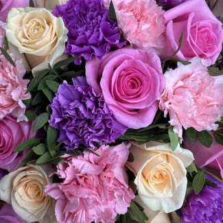 «Радуга» – это пышный букет, бутоны которого окрашены в теплые тона. Цветы прекрасно гармонируют друг с другом, хорошая компактность (30 см в высоту и 20 см в ширину) позволит поставить их даже в небольшую вазу. Состав зависит от выбранного размера, есть стандартный, куда входят 14 гвоздик, писташ и 17 роз, а увеличенный делюкс, в котором на 2 гвоздики и 4 розы больше. При создании подобных наборов качество исполнения и обслуживания стоит на первом месте.