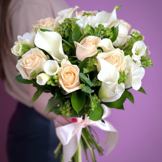 Необычного вида букет Стихия желаний состоит из белоснежных калл, кремовых роз, изящной фрезии и свежей зелени буплерума и салала. Композиция выглядит гармоничной и законченной, в том числе благодаря округлой форме букета.